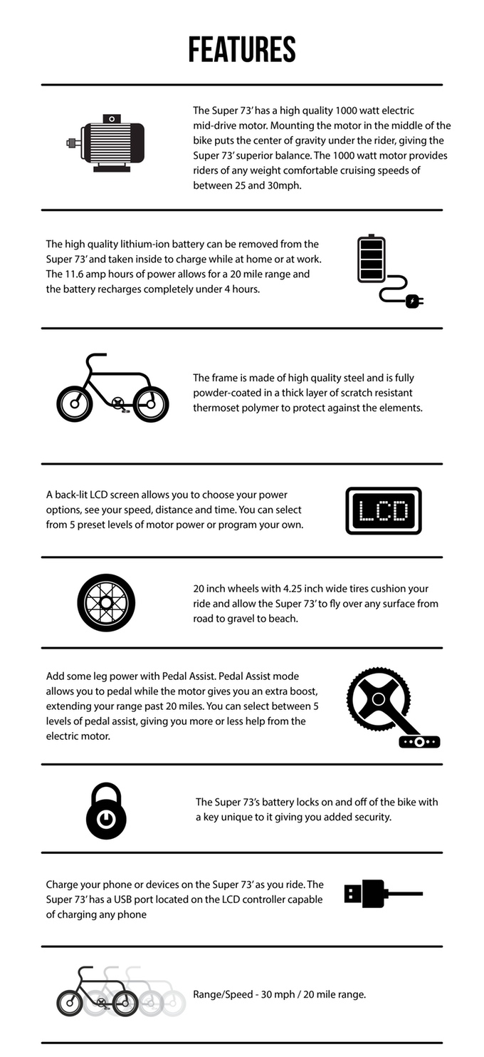 Super 73 merupakan basikal elektrik yang dipasang dengan motor elektrik berkuasa 1,000 watt dan mampu bergerak sejauh 36 kilometer dengan halaju maksima 48km/j.