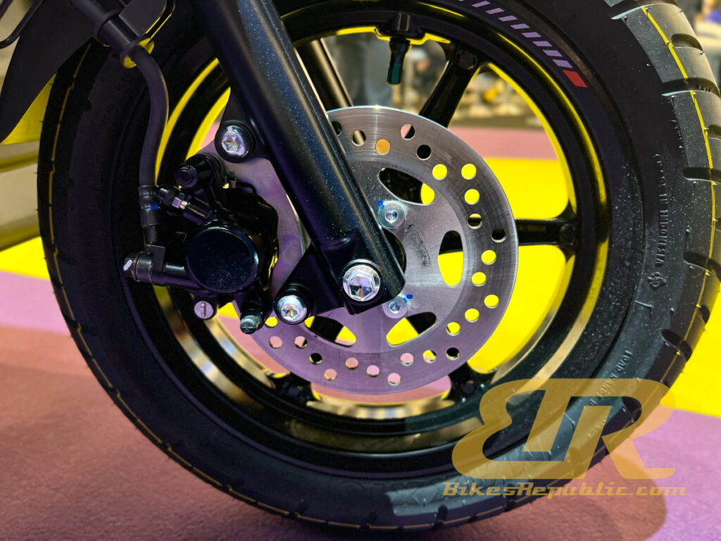 - Saiz tayar dan rim ialah 90/90-14 (hadapan), dan 100/90-14 (belakang) dengan tayar tanpa tiub.
