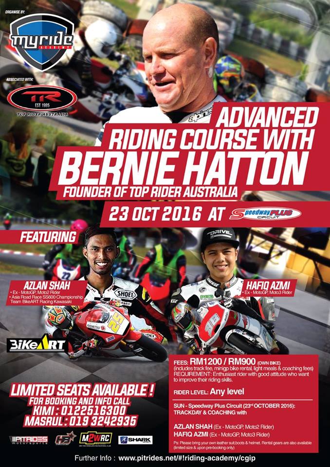 Kursus menunggang anjuran MyRIDE Academy dan juga Pitrides kali ini telah menjemput seorang pelumba yang cukup berpengalaman dari Australia iaitu Bernie Hatton, pengasas Top Rider Australia. Bernie Hatton merupakan seorang individu yang gemar berlumba dan juga sentiasa aktif dalam berkongsi maklumat dan memberi ajaran kepada penunggang dan pelumba yang lain. (more…)