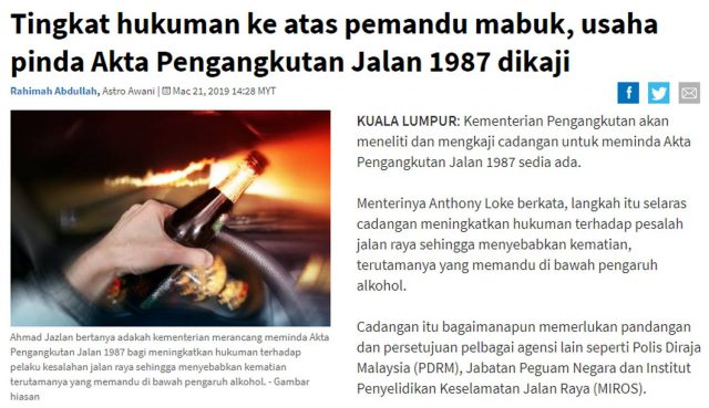 Haramkan arak atau pinda Akta Pengangkutan Jalan 1987 agar mana-mana individu tidak sewenangnya memandu ketika berada dalam pengaruh alkohol.